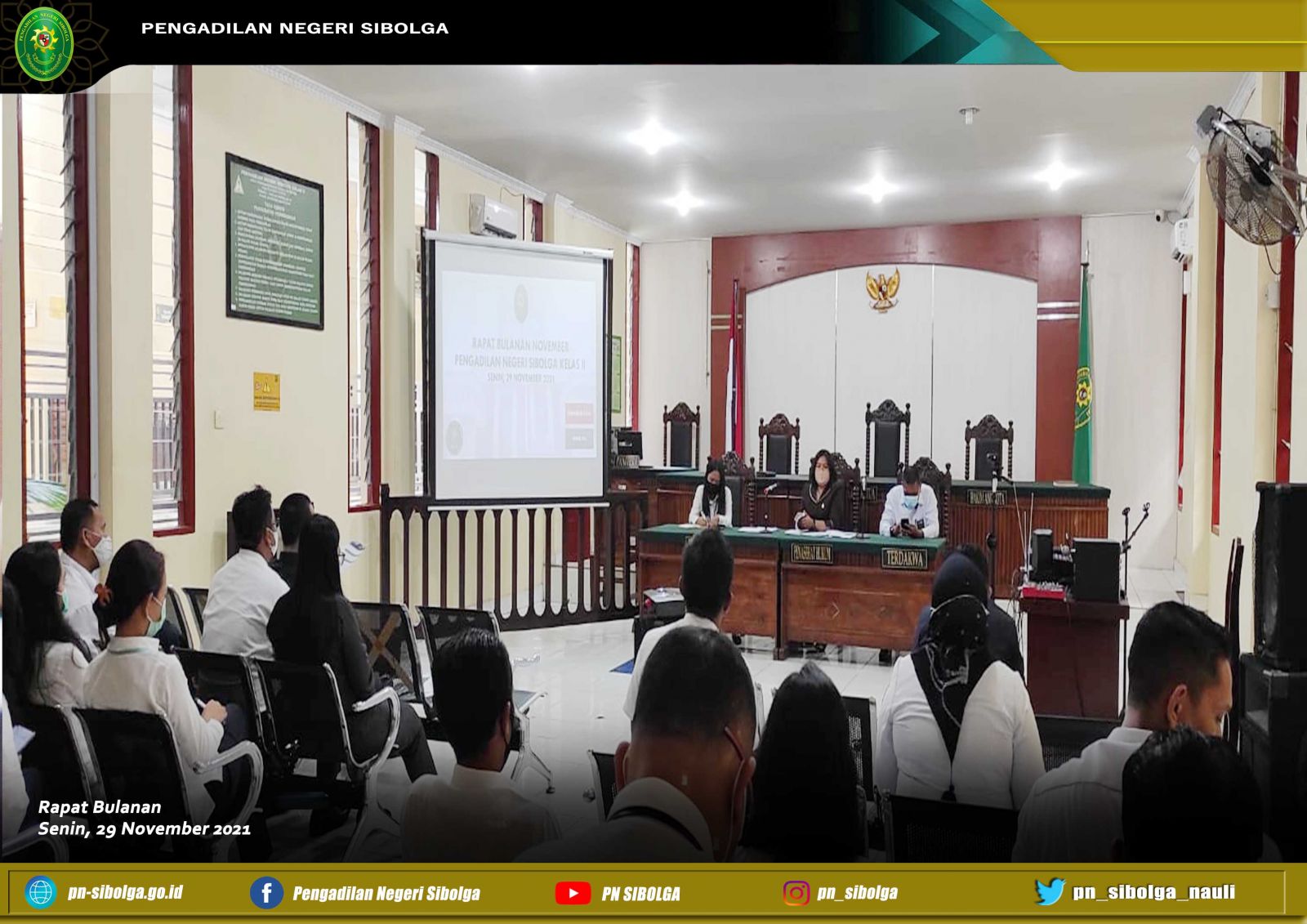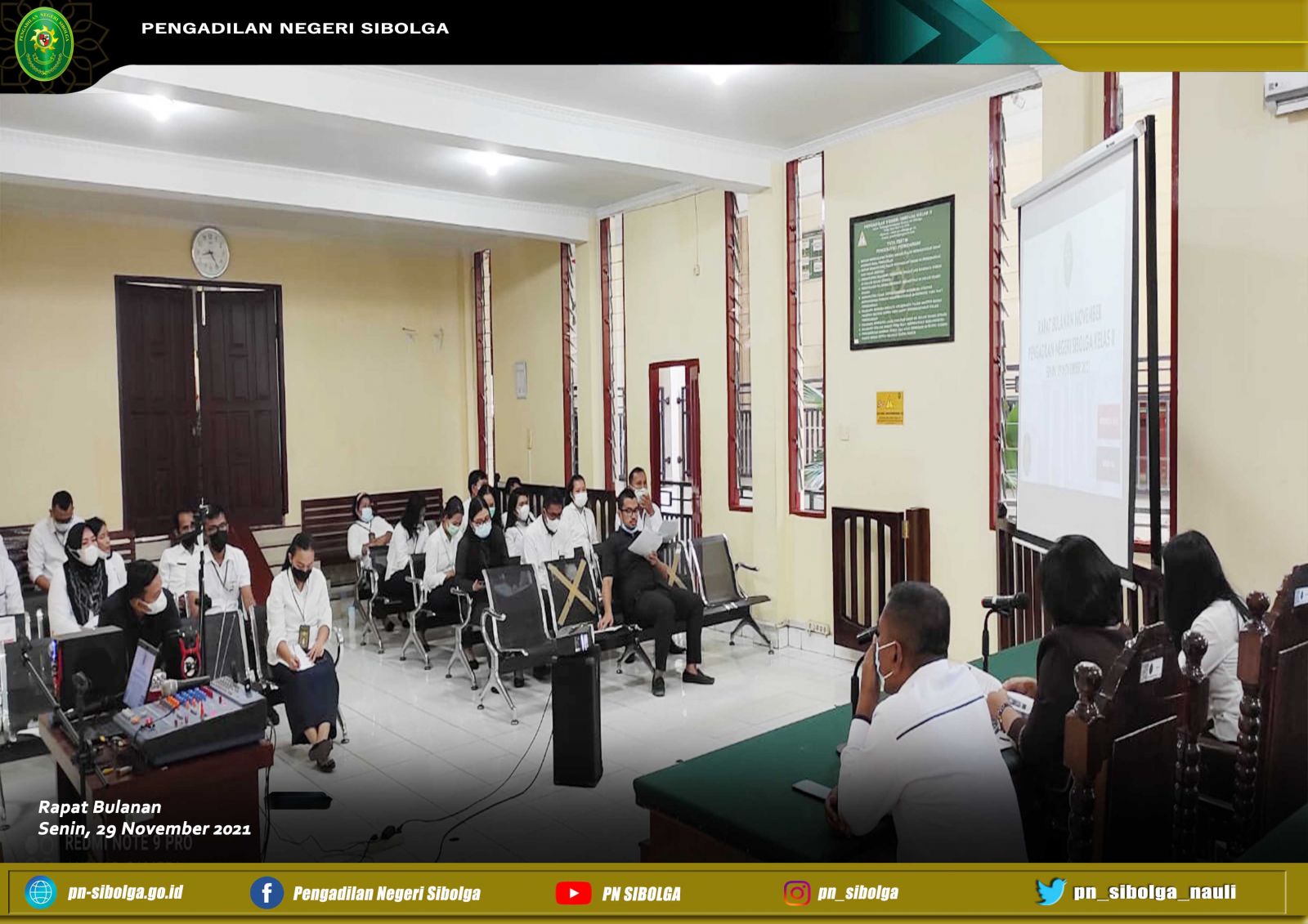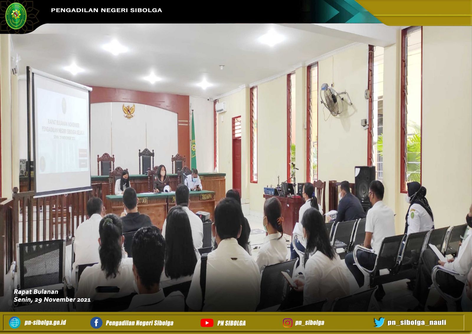 Sibolga – Senin, 29 November 2021. Pimpinan dan aparatur Pengadilan Negeri Sibolga melaksanakan Rapat Bulanan Periode Bulan November 2021 bertempat di Ruang Sidang Cakra Pengadilan Negeri Sibolga.