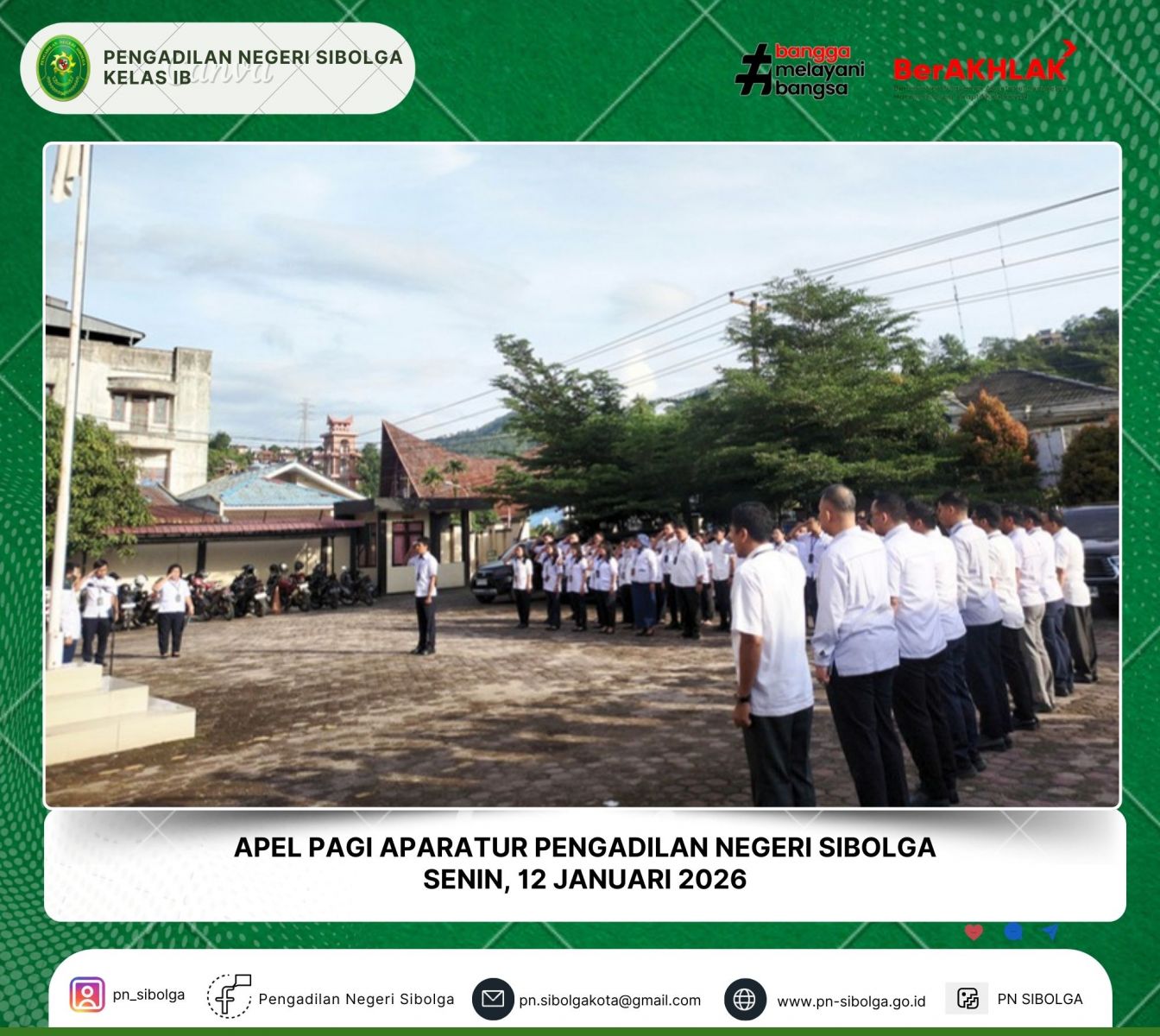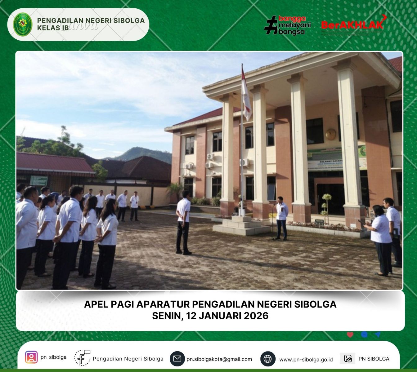 Pengadilan Negeri Sibolga melaksanakan kegiatan Apel Pagi pada Senin, 12 Januari 2026, bertempat di Lapangan Kantor Pengadilan Negeri Sibolga. Kegiatan apel pagi ini dipimpin oleh Bapak Sakirin, S.H., Hakim Pengadilan Negeri Sibolga, dan diikuti oleh seluruh Hakim serta Aparatur Sipil Negara (ASN) Pengadilan Negeri Sibolga.