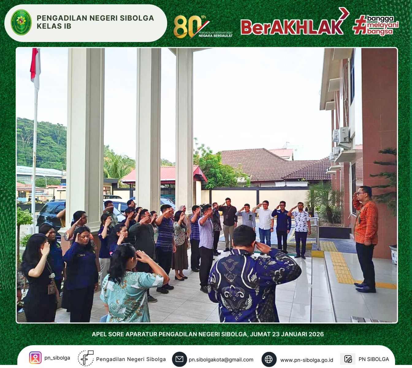 Pengadilan Negeri Sibolga melaksanakan apel sore pada Jumat, 23 Januari 2026, yang dipimpin oleh Bapak Chandra Khoirunnas, S.H., M.H. Kegiatan ini diikuti oleh para hakim, pejabat fungsional dan struktural, serta seluruh ASN Pengadilan Negeri Sibolga.