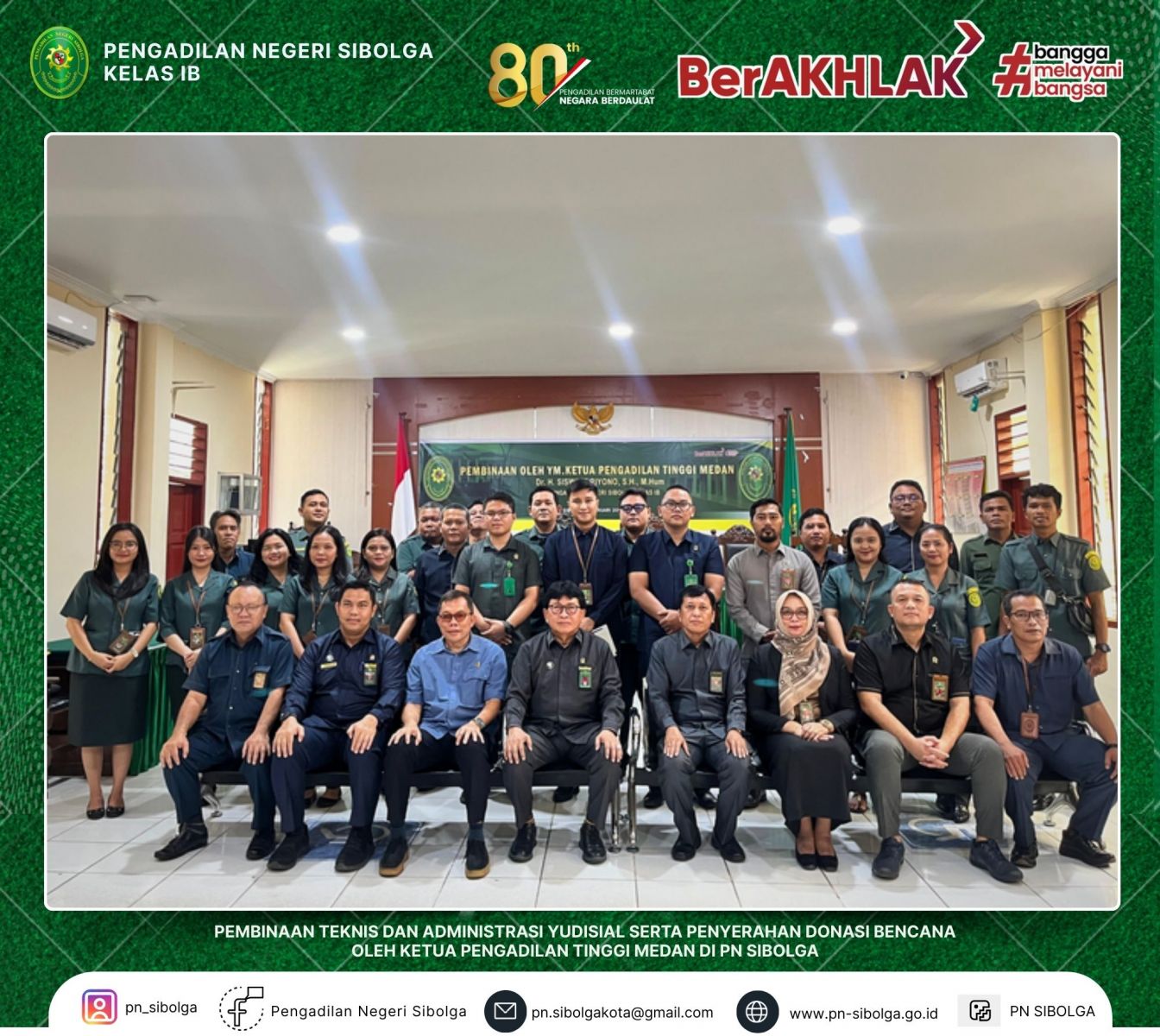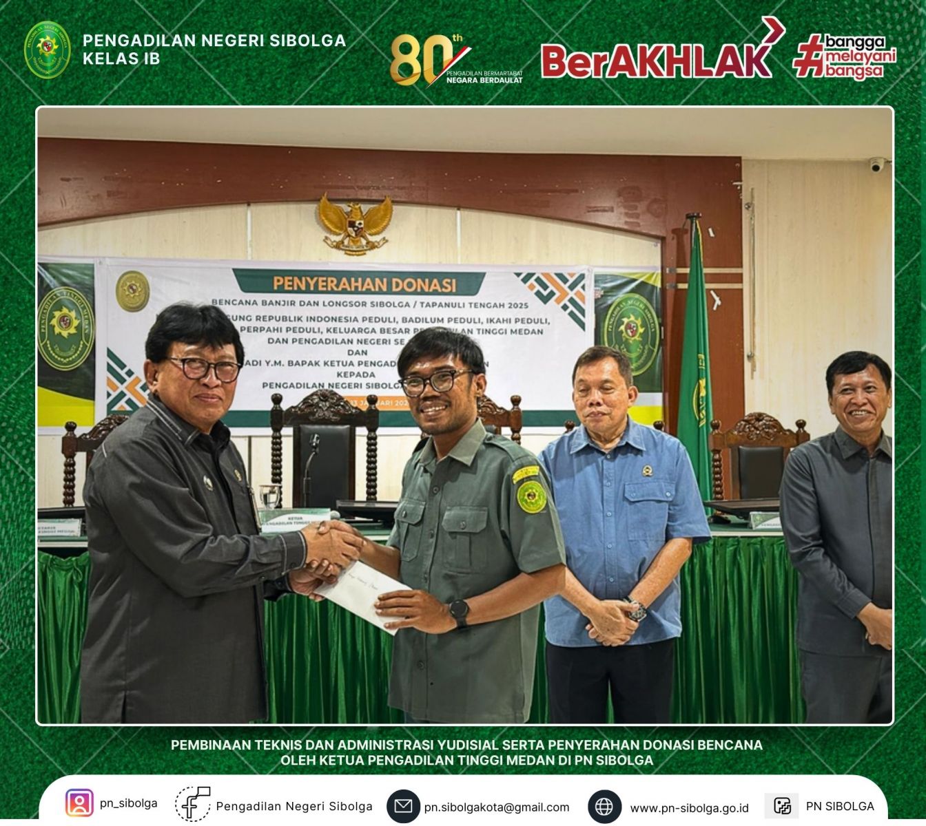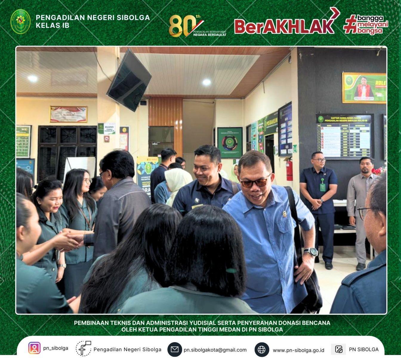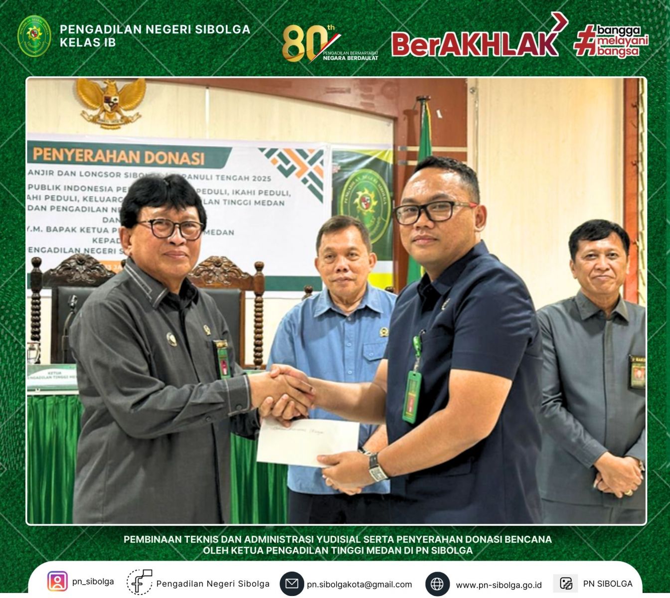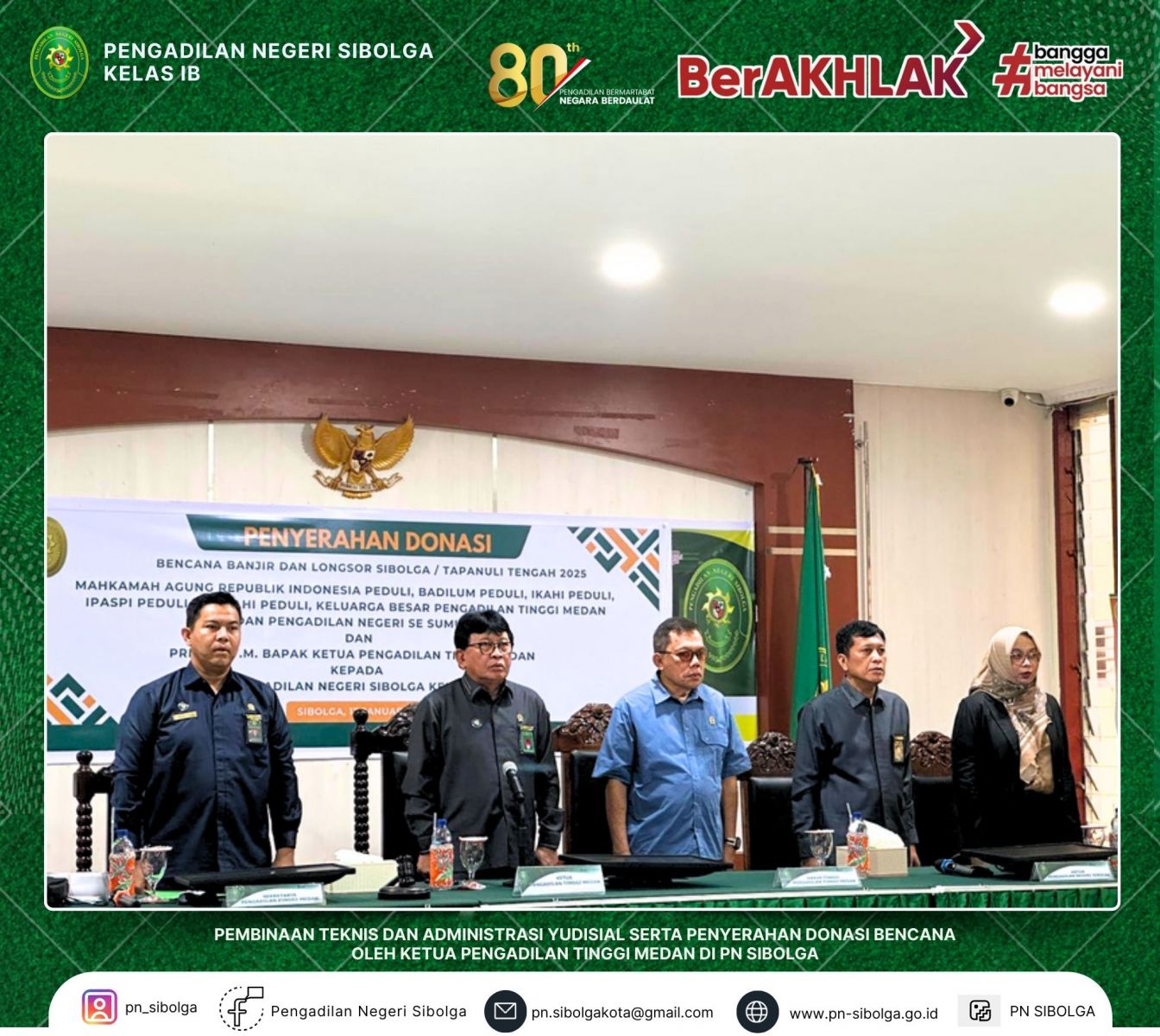 Sibolga — Ketua Pengadilan Tinggi Medan, Yang Mulia Dr. H. Siswandriyono, S.H., M.Hum., melaksanakan Pembinaan Teknis dan Administrasi Yudisial sekaligus penyerahan donasi bagi korban bencana longsor dan banjir di Pengadilan Negeri Sibolga, Selasa (13/1/2026).